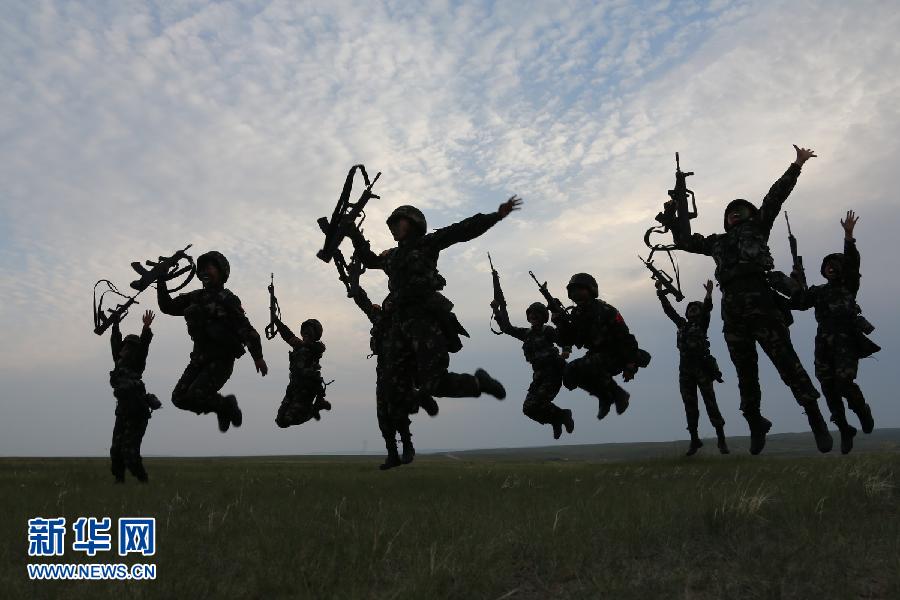 在朱日和训练基地,参加完当日射击训练任务的女子特战连官兵(7月17日摄)。 “八一”前夕,由北京军区某旅组建的我陆军首支女子特战连在内蒙古朱日河训练基地进行强化训练,不断提高女特战队员复杂条件下的实战硬功。据了解,这些特战女兵年龄最大26岁、最小18岁,全部大专以上学历,具备格斗、攀岩、捕俘等特战技能。2013年基础课目考核中,她们全部取得射击、体能等12个课目“良好”以上成绩。铿锵玫瑰别样青春,她们以实际行动践行强军目标,绽放强军梦想。新华社记者 王建民 摄