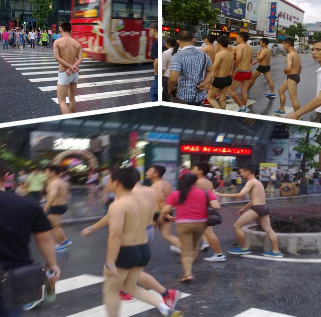 7月28日,下午5时许,10余名穿着四角内裤的男子从佛山祖庙的华辉大厦鱼贯而出,他们身穿红、黑、白等颜色内裤,光着上身,还跑着穿过斑马线,引得不少司机探出头观看。他们是附近健身俱乐部的业务员。“裸奔男”们称,他们因完不成公司布置的拉客任务,就必须在“裸奔、下跪、吃苦瓜、乞讨”等多种惩罚方式中选择一种。该健身俱乐部负责人表示,这是对员工的一种锻炼方式。