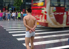 7月28日,下午5时许,10余名穿着四角内裤的男子从佛山祖庙的华辉大厦鱼贯而出,他们身穿红、黑、白等颜色内裤,光着上身,还跑着穿过斑马线,引得不少司机探出头观看。他们是附近健身俱乐部的业务员。“裸奔男”们称,他们因完不成公司布置的拉客任务,就必须在“裸奔、下跪、吃苦瓜、乞讨”等多种惩罚方式中选择一种。该健身俱乐部负责人表示,这是对员工的一种锻炼方式。