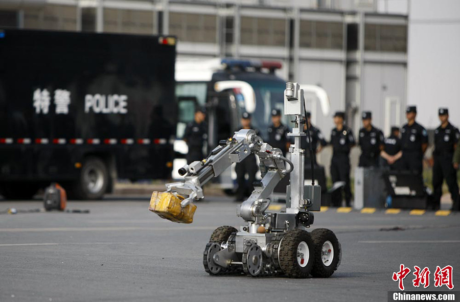 8月16日,乌鲁木齐市特警八支队在即将召开的第三届中国-亚欧博览会举办地,新疆国际会展中心举行反恐处突实战演练。据介绍,该特警支队还将在第三届中国-亚欧博览会召开前举行多次实地防恐演练次数,从实战中总结经验,确保第三届亚博会顺利举办。图为特警使用排爆机器人排查爆炸物。方涛 摄