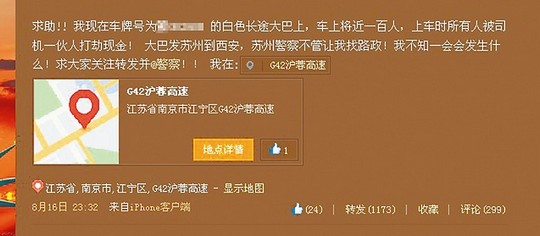 16日23时32分,网友“@长墙外的世界”发求助称,他正在一辆白色长途大巴上,车上近百人被司机一伙人打劫!大巴从苏州到西安,求关注转发。一石激起千层浪,这条微博很快就被人关注到,尽管是深夜,微博转发很快达到了几百次,到17日早上已经超过千次。
