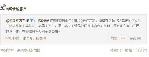 人民网北京9月2日电 据宁波市公安局海曙分局官方微博"海曙警方在线"消息,9月2日中午12时20分许左右,海曙辖区咏归路菜场附近发生一起故意杀人案件。一名男子死亡,另一名女子受伤已送医院治疗。目前,警方正在全力开展侦查工作,有关信息将及时予以公布。
