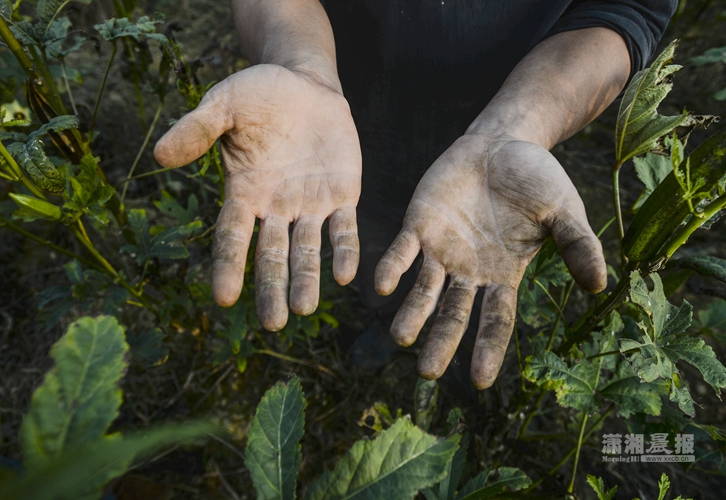 11月4日,岳阳县,赵文的生态农场里,大学毕业没几年的贺明礼手上有着厚厚的茧。图/记者 李坤