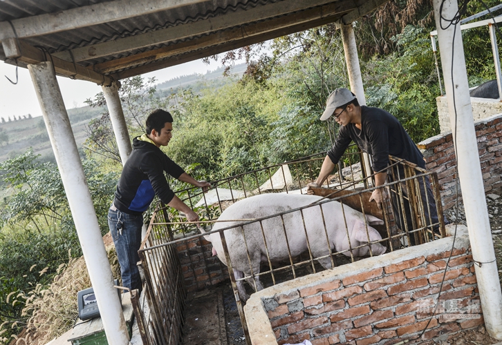 11月4日,岳阳县,赵文的生态农场里,四个人合力赶一头猪上车,准备拉去屠宰场。图/记者 李坤