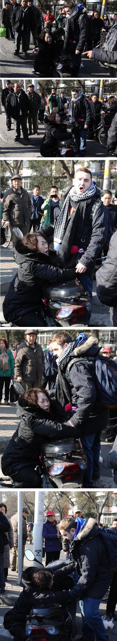 新京报讯(记者 杨锋) “老外街头扶摔倒大妈遭讹1800元”,今日,网上一组图片引起广泛关注。而据新京报记者调查,此组图片所表述内容与事实有所出入,该大妈的确被老外撞倒。目击者称,老外驾驶无牌摩托车撞人后,用中文辱骂被撞者。