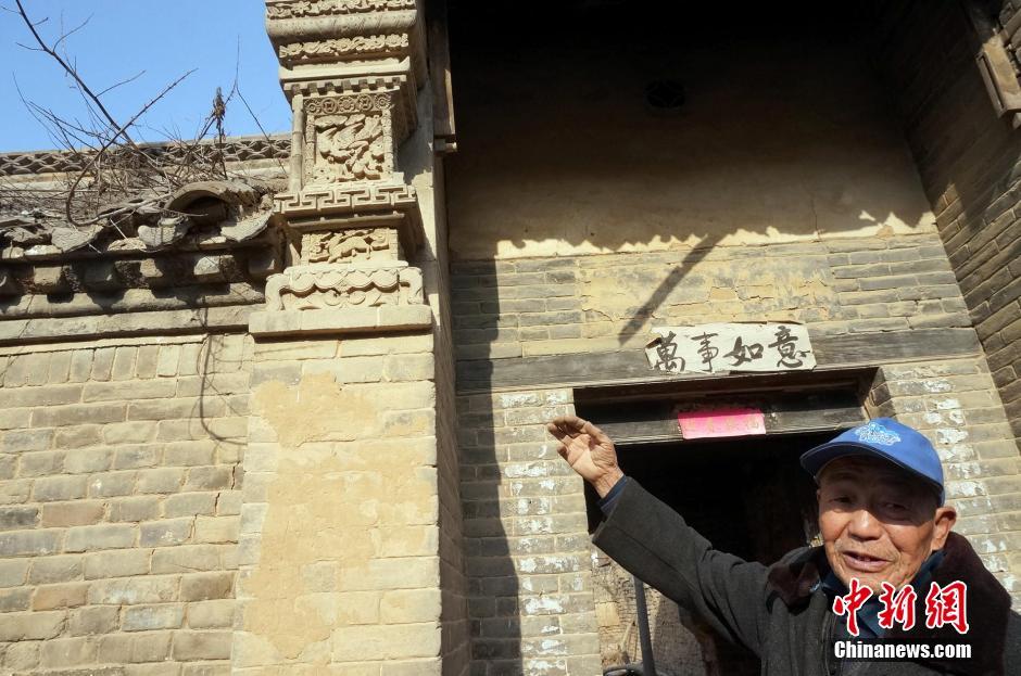 安氏后人安保山向记者介绍保存完整的精美砖雕。