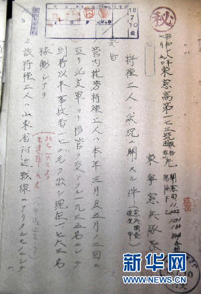 这是1943年日伪当局为征用一般劳工及强制使用和管理“特种工人”的相关文件(1月7日摄)。 新华社记者 王昊飞 摄