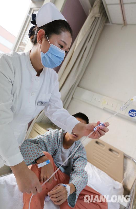 这位少年患了肾炎,孙琳在为她调节滴药速度(11月6日摄)。千龙网记者 张启新摄