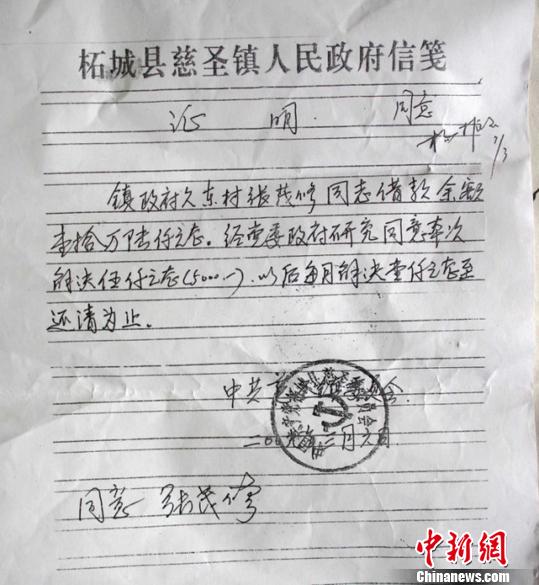 提起张茂修一事,慈圣镇党委书记杨振玉称,镇政府欠钱不归他管,但他承认欠钱的事,且不清楚当年借张茂修的钱用到什么地方了。杨解释称,政府欠钱不是张家这一户,如果就这一户也早还完了,其他人有的一分没给。“镇政府每月办公经费才3万元,就这也是从‘牙缝里抠出来的’,我也不可能回家卖东西还钱。”杨振玉说。