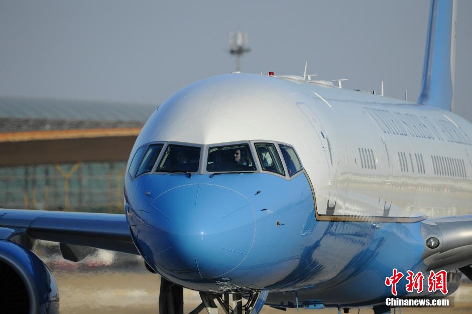 3月20日,美国总统奥巴马的夫人米歇尔·奥巴马乘飞机抵达北京,开始对中国的访问。同机抵达的还有米歇尔的母亲玛丽安·罗宾逊和两个女儿玛利亚和萨沙。图为米歇尔·奥巴马乘坐的专机。侯宇 摄