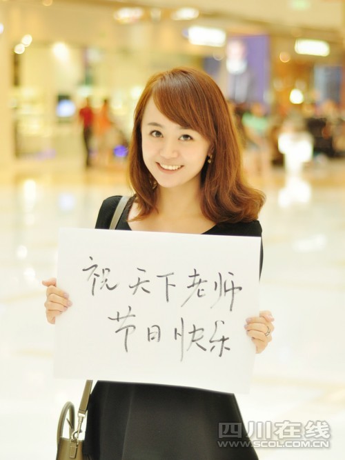 9日,在教师节来到之时,一组“龙泉微视界美女支教”的照片在网上火起了起来。记者初见祝靖是在咖啡店,她是典型的成都美女。当她以第一名的成绩拿到四川大学法学院的民商法硕士学位后,选择到贵州省兴义市威舍镇阿依村阿依小学支教,成为了一名英语教师。图为祝靖教师节快乐。 方炜 摄 图片来源:四川在线