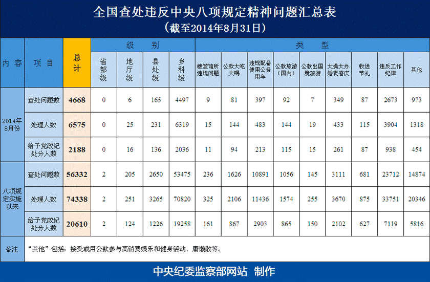 全国查处违反中央八项规定精神问题汇总表(截至2014年8月31日)