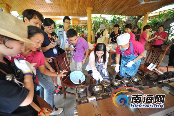 “百城百网海南深呼吸”——2014全国重点网络媒体海南行采访团在万宁兴隆热带植物园体验制作椰子饼(南海网记者徐开飞摄)