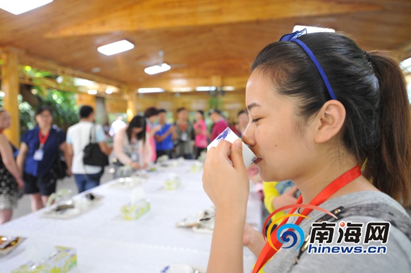 “百城百网海南深呼吸”——2014全国重点网络媒体海南行采访团在万宁兴隆热带植物园品尝自己煮泡的咖啡(南海网记者徐开飞摄)