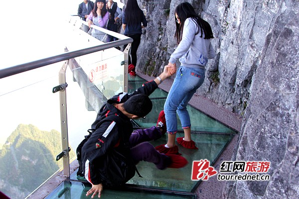 张家界玻璃栈道走红 小伙争相扶墙吓到腿软