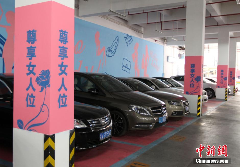 10月13日,重庆某商场内的“女司机车位”。近日,重庆一商城车库内设置了10个专供女性司机停车的专用停车位。这10个特别的车位不仅停车方便,靠近出入口,地面和墙上都用粉色系涂料装饰,旁边立柱上也写着“尊享女人位”几个醒目的大字。商场这一举动引发了网友的争议。有人认为,管理方考虑到女司机停车、倒车不易,非常人性化,也有人认为这对男女客户都是种歧视,如果是想让女性更安全地停好车,不如设个新手车位。中新社发 周毅 摄