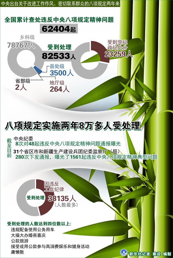 图表:八项规定实施两年8万多人受处理 新华社记者 秦迎 编制