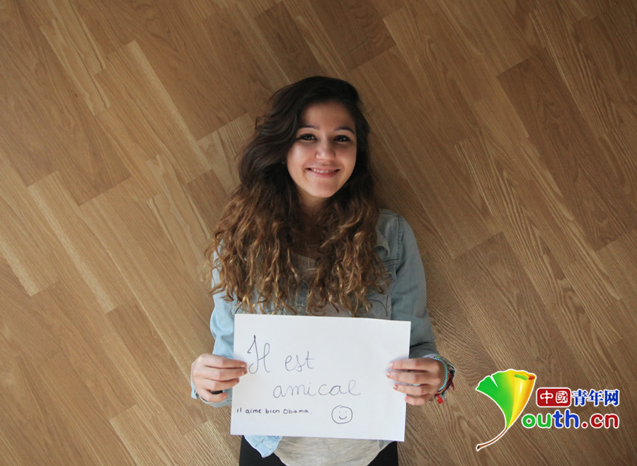 来自突尼斯的Rania Joudi今年17岁,她已经在中国生活10年了。她说习主席在心目中的印象是优雅友善,和蔼可亲,平易近人。记者问她怎么感受到习近平的和蔼可亲、平易近人,她说:“电视上看到,他对身边的人很好。”顿了顿,她笑着说,“他和奥巴马很铁。”