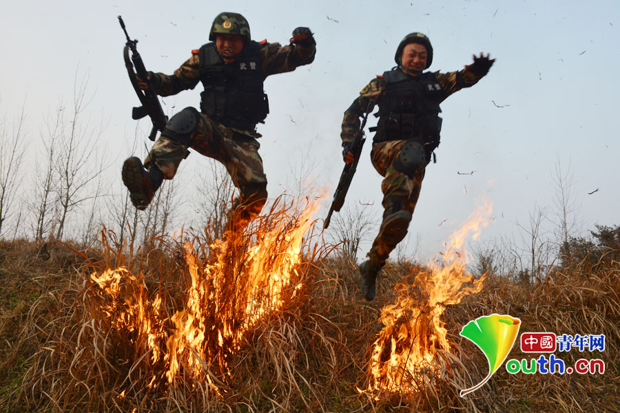 两名武警战士在实战训练中跨越火障。 中国青年网通讯员刘仕琪 摄