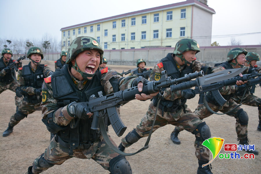 武警战士们正在进行刺杀操训练,喊声猛如虎。 中国青年网通讯员刘仕琪 摄