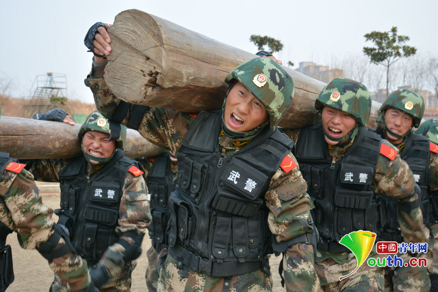 武警战士们正在参加扛圆木训练。中国青年网通讯员刘仕琪 摄