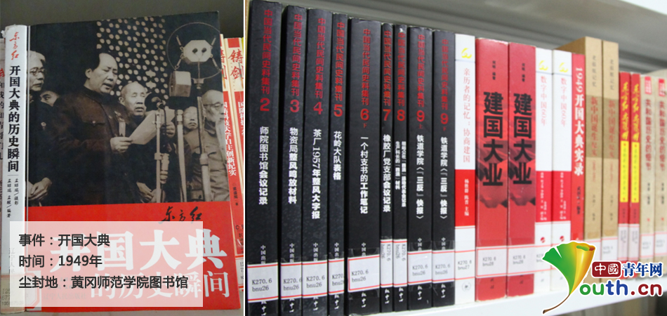 1949年10月1日,毛泽东在天安门城楼宣布中华人民共和国成立,中国历史翻开新的一页。随后,三反五反、土地革命等开展起来。图为黄冈师范学院图书馆中关于开国大典的图书。中国青年网通讯员 李莉 摄