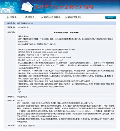 重庆市卫计委公开信箱“关注肾功能衰竭病人的生存现状”问答截图。