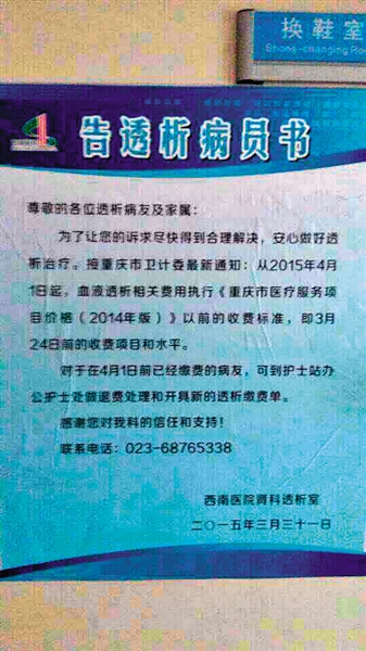 昨日,重庆市第三军医大学大坪医院血液透析室一工作人员称,3月31日晚接到卫计委的收费调整通知,将恢复到医疗调价前的收费标准。