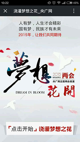 “‘四个全面’战略布局是针对新形势下的机遇、挑战和历史任务而提出来的重要战略思想和战略布局,既有目标又有举措,既有全局又有重点,凸显了治国理政总体方略的顶层设计,引领着民族复兴伟大梦想。”李涛介绍说,今年,央广网融媒体新闻指挥中心推出《梦想花开——2015年两会报道》网页版与手机端专题,专题聚合中央台17个频率、央广网独家资源形成报道矩阵,内容布局贴近民生,重点突出深度报道《更好的2015》、特色音频策划《听听两会》、移动端交互产品《浇灌梦想之花》、图解策划《花花两会课堂》等独家内容。设计清新大气,包含音频、视频、FLASH等多种新媒体设计模式,紧紧围绕“四个全面”战略布局等热点问题展开报道。不仅确保了传播内容的完整、准确、及时,也使传播内容更有可读性、可视性、可听性。
