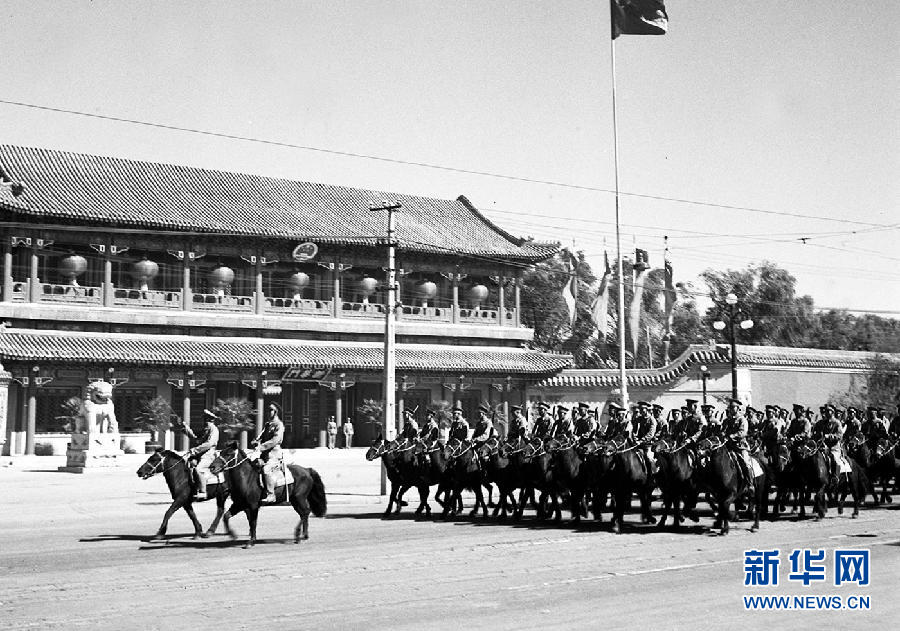 这是1952年国庆阅兵式上,中国人民解放军骑兵部队经过新华门。 新华社发(资料照片)
