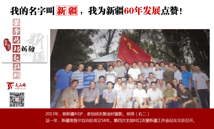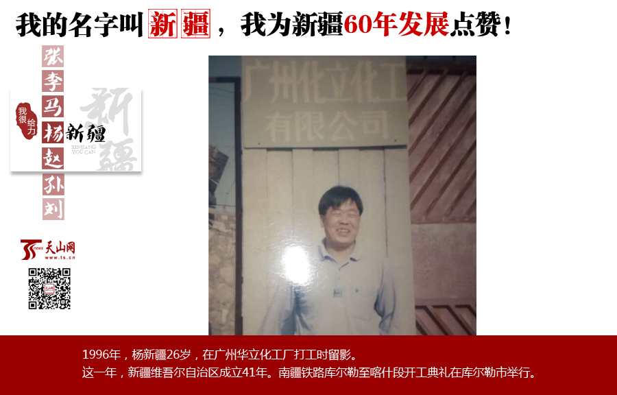杨新疆:叫这个名字挺自豪,尤其去外地,人家一听就知道我是新疆人,会主动找我聊天。1996年我去广州打工,身边来自全国各地的工友对新疆都很好奇,空闲的时候,就想听我说说新疆到底啥样,我就给大家介绍新疆,这让我认识不少朋友。