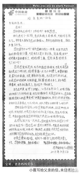 “妈妈跟我说,看到星星眨眼睛,就是她在想我。”小霞说,满天的星星总会勾勒出人的轮廓,她总是联想到妈妈。她会站在黑暗中和星星说话,就像面对妈妈一样,诉说自己遇到的开心或难过,常常一站就是半个小时。下雨的时候,她就打把伞走进雨中,对着雨滴说着自己的思念。图为信件全文。
