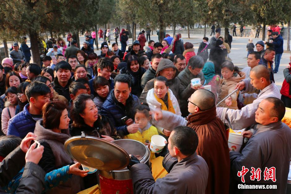 1月17日,农历腊八,少林寺举行隆重的施粥活动,在少林药局和郑州辖区设10个施粥点。当日,共施粥20多万份。少林药局门外,数百信徒和游客排长队,等待品尝“少林五行腊八粥”。少林寺 供图
