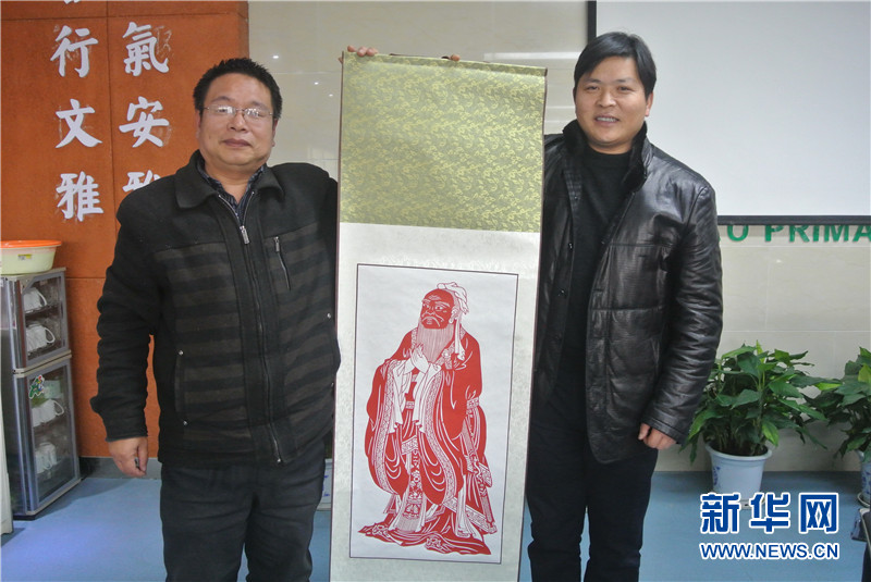 宏占久将自己耗时十几个小时的《孔子像》赠与铁心桥小学周校长
