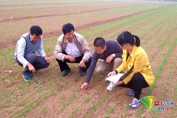 2015年11月,王辉(左二)与团队人员考察小麦出苗情况。王辉供图