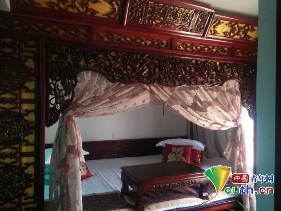 传说中客栈里拥有美好寓意的“龙凤床”。 中国青年网记者吕玮摄