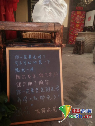 “你一定要走吗?可不可以休息一下 ,像我一样,偶尔发呆,偶尔耍赖,偶尔睡个懒觉,你一定要坚定地走吗,弄得大家都老了。”这句话写在一间外观古朴、内涵时尚的咖啡店里。店主是雷东毅,出生于1994年,在外奔波多年、干过几份工作后,一年前回到家乡。