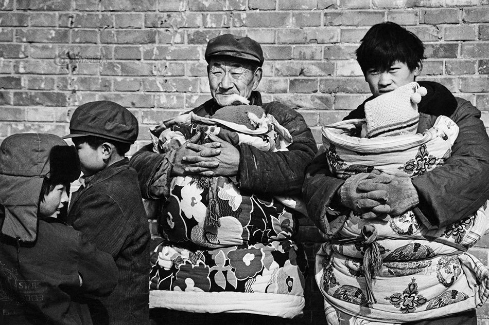 那时候农村当然也实施计划生育。村里的墙上也用难看的字体写着各式各样的标语。但是八十年代初,农村一家两孩的现象还是不少见的。不像现在,农村人也自愿生一个娃,因为年轻人们都说再多一个养不起。图为1983年,河南农村,抱孩子的爷爷和父亲。摄影:朱宪民/视觉中国