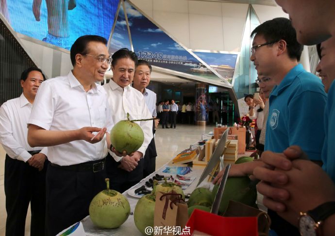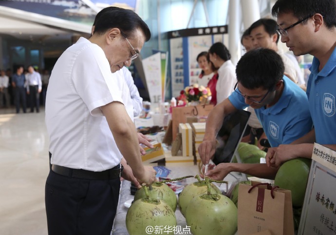 【李克强鼓励年轻创业者:要做创新创意代表】李克强22日在三亚市民游客中心考察海南创意旅游纪念品展区。一位创业大学生现场演示自己发明的“开椰器”:在椰壳上一拧,即可插上吸管喝到椰汁。总理试用后说,这个发明虽小,但市场不小。旅游产品尤其需要创意。他鼓励展区年轻创业者,要做创新创意代表。
