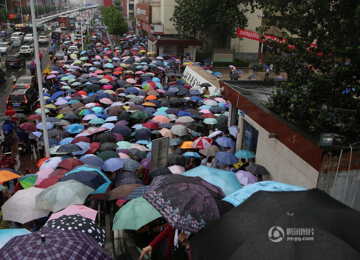 2016年6月7日,河南省郑州市,2016年全国高考开幕。当日下午5点10分左右,河南省实验中学门口,考生已经考完走出考场,和冒雨等候的家长汇成了五彩斑斓的“雨伞阵”。