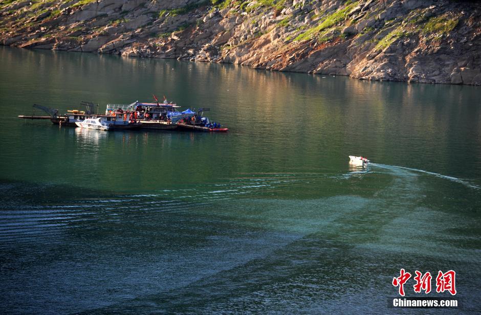 6月8日,四川广元白龙湖“双龙号”游船翻沉搜救现场,水下机器人再次在沉船附近水域发现3名遇难者遗体,正在进行身份确认。图为游船翻沉水域失踪人员搜寻工作正紧张有序展开。(拍摄于6月7日) 中新社记者 刘忠俊 摄