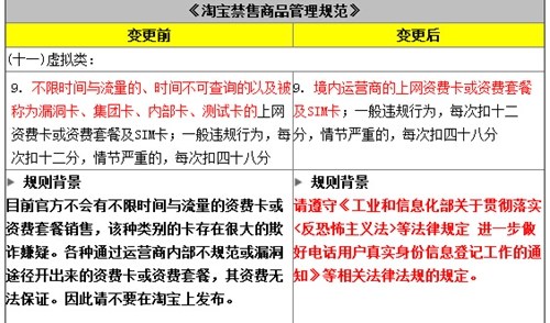 7日,淘宝变更后的《淘宝禁售商品管理规范》正式实施。变更前,淘宝禁售不限时间与流量的、时间不可查询的以及被称为漏洞卡、集团卡、内部卡、测试卡的上网资费卡或资费套餐及SIM卡。变更后为:禁售境内运营商的上网资费卡或资费套餐及SIM卡。简而言之,境内手机号码/套餐/增值业务彻底从淘宝消失。
