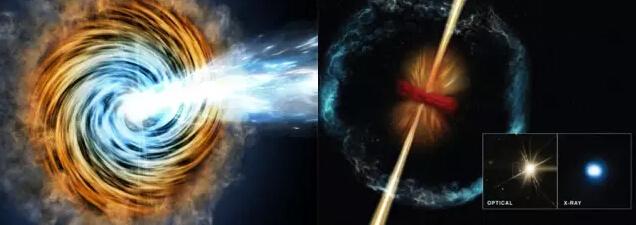 ▲左:伽玛暴的正面示意图;右:伽玛暴的侧面示意图 (图片来自网络)