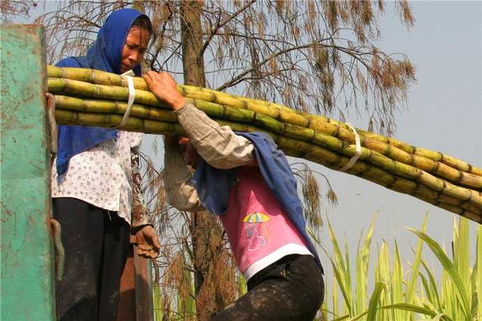 女农民工90多斤体重,每扛一次甘蔗10元钱,一趟100斤甘蔗,装满一辆车,要扛二十几趟甘蔗。