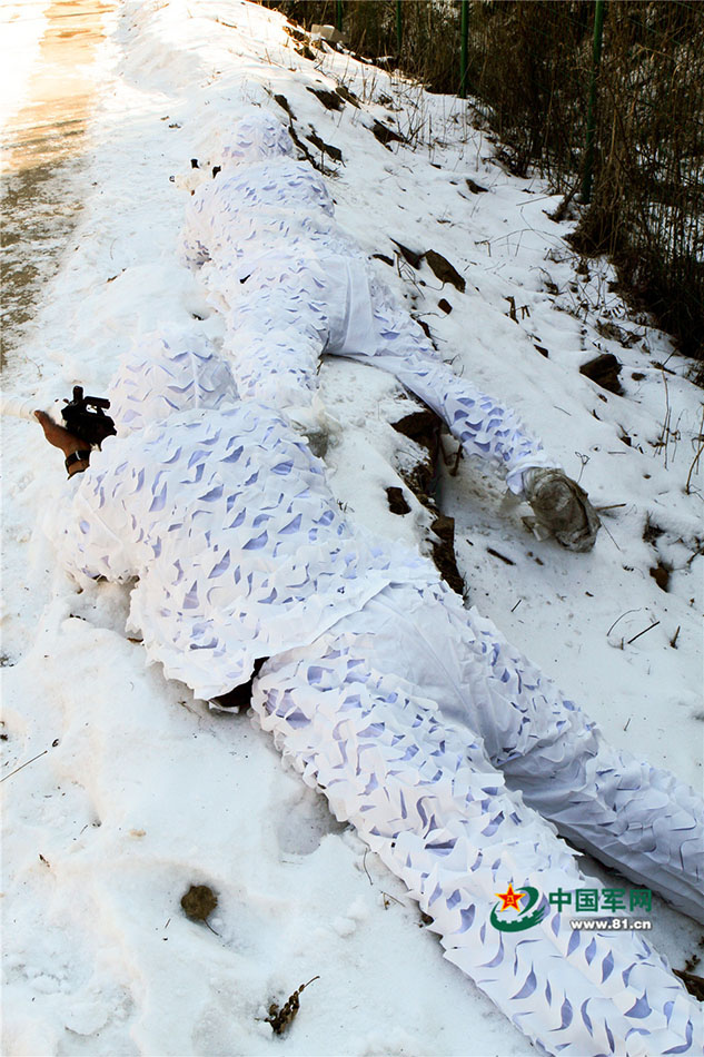 狙击手趴在冰冷的雪地里潜伏。