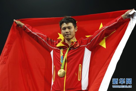 这是2016年8月20日,中国选手陈艾森在2016年里约奥运会跳水男子十米跳台决赛颁奖仪式上。 新华社记者丁旭摄