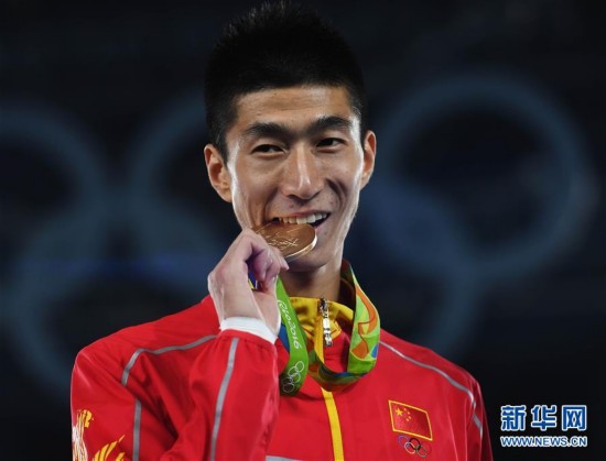 这是2016年8月17日,赵帅在2016年里约奥运会跆拳道男子58公斤级决赛颁奖仪式上。 新华社记者韩瑜庆摄