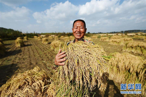 黑龙江省五常市龙凤山镇有机水稻种植户裴凤双捧起丰收的稻谷。新华社记者王建威摄