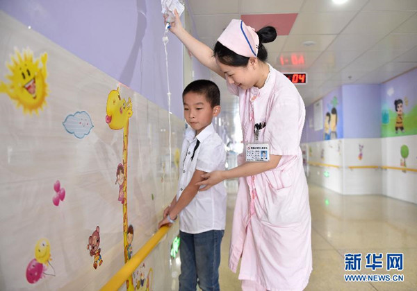 在福建省福州儿童医院新启用的病房大楼,护士在贴满卡通画的走廊里陪护一名小患者。新华社记者宋为伟摄
