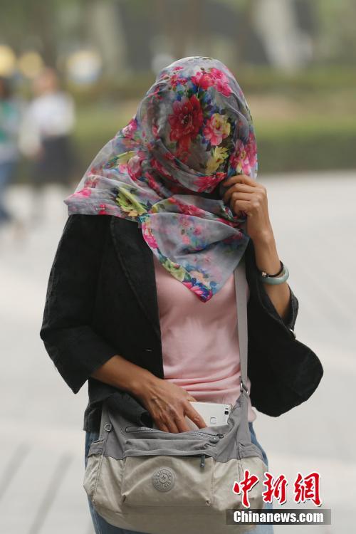 5月4日,北京城区遭沙尘笼罩,民众头戴纱巾出行。 中新社记者 韩海丹 摄